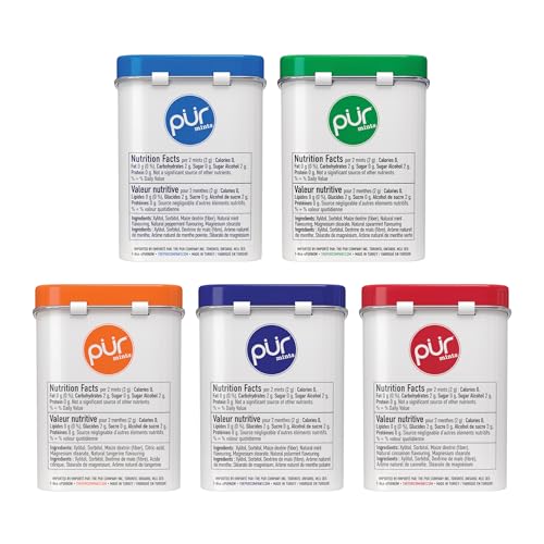 - VARIETY PACK: The best way to try our flavours! PUR's aspartame-free mints feature a blast of flavours. Contains: Spearmint, Peppermint, Tangerine Tango, Polar Mint, and Cinnamon, KICK ASPARTAME: Naturally sweetened with xylitol. Xylitol is an all-natural sugar alcohol that looks and tastes just like sugar, yet has 40% fewer calories., ALLERGEN FREE MINTS: PUR Mints are made just for you. We are Vegan, Non-GMO, Sugar Free, Gluten Free, Soy Free, Nut & Peanut Free, and made in Turkey., OUR MISSION: PUR creates products with the highest quality ingredients to help you make simple substitutions so that your everyday decisions to live a healthier lifestyle are effortless.