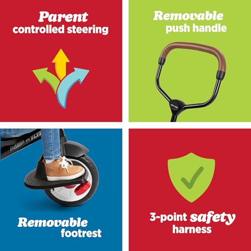 - 4 TRICYCLES IN 1: This trike grows with your child through different riding stages. Easily convert between 4 growing stages by removing the accessories. The 4 riding stages include infant trike (12 mos. – 18 mos.), steering trike (18 mos. – 24 mos.), learn-to-ride trike (2 – 3 yrs.), and classic trike (3– 5 yrs.)., SAFETY FEATURES: This trike includes a UV protection canopy, 3-point harness with shoulder pads, removable wrap around snack tray with cup holder, comfort seat pad and a removable footrest., ULTIMATE STORAGE: Made with 100% recycled fabric, the XL rear storage basket holds all your on-the-go essentials for convenient carrying., ADJUSTABLE SEAT: The adjustable seat grows with your child and ensures years of use!, PARENT-CONTROLLED STEERING: Adult Steer & Stroll adjustable push handle with premium vegan leather grip provides easy steering and effortless control.