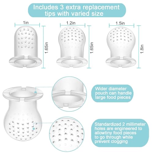 - 【100% SAFE】Our baby fruit feeders are made with certified premium 100% Food Grade Silicone that’s BPA, PVC, Latex, Latex, Metals, Phthalate, Toxic and Rust free. Our fruit pacifier allow your baby to gum on solids long before teeth come in. Best of all, you don’t have to worry about your baby putting choke-sized chunks of food into mouth., 【PROTECTIVE CAP & BONUS PACIFIER CLIP】 Our baby fruit feeder pacifier come with a protective cap. Not only does this cap keep the silicone tip clean and hygienic, but also stops you covering your hands with baby food while you fill the food reservoir. Once you have filled the food reservoir to capacity, you simply lock the handle into position and give it to your baby., 【EASY CLEANING & STORAGE】Silicone fruit feeder for baby with 3 silicone replacements are super simple to clean. A light scrub under warm soapy water is all it takes to wash the remainder of your baby’s meal out., 【100% MULTI-FUNCTIONAL】PandaEar baby food feeders combine the functionality of a pacifier. You don’t even need to mash the food up. The generous food storage pouch stores fruits, vegetables, breast milk, or puree. No more dirty fingers. Great for teething babies. Textured surfaces that massage and stimulate gums are perfect for assisting the eruption of front, middle, and back teeth., 【 GUARANTEE】We genuinely care for you and offer unconditional warranties with no strings attached. If you're ever dissatisfied with PandaEar baby fresh food feeder, contact us for a full refund.