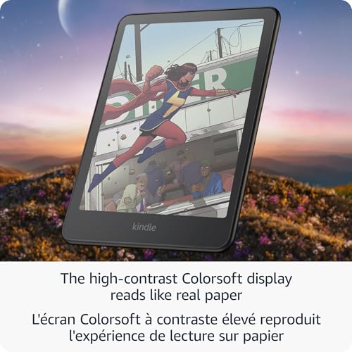 - Read in colour – The new 7" Colorsoft display is high-contrast and easy on the eyes, with paper-like colour that brings covers and content to life. Highlight text in yellow, orange, blue, and pink., Marathon reading – A single charge via USB-C lasts up to 8 weeks, or power up with the wireless charging dock (sold separately)., Adapts to your surroundings – The glare-free display and auto-adjusting front light let you read in the brightest sunlight or late into the night., Escape into your books – Your Kindle doesn’t have social media, notifications, or other distracting apps., More books in more places – Bring your library along with the thin, light design and 32 GB storage., Waterproof and worry-free – Take your stories by the pool, in the bath, or anywhere in between., Massive selection – Instantly access over 15 million titles in the Kindle Store worldwide, and add a Kindle Unlimited subscription for all-you-can read access to a catalog including best sellers., A brand-new experience – The Colorsoft display is optimized for reading in colour and is different from the Paperwhite display. Use the Page Colour feature to invert the black text and white background inside books. While different from Dark Mode, you can read comfortably and view colourful images and covers.