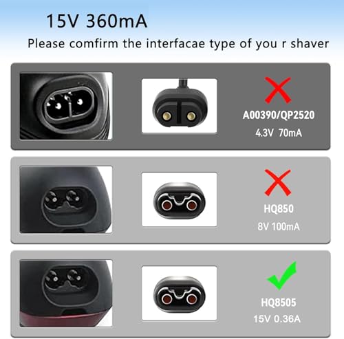 - Output: 15V ⎓ 0.36A 5.4W max 15V 0.4A 6W, Input: 100-240V ~ 50/60HZ, 15V 360mA Charger Cord Line length: 5.9ft, compatibility:15V 360mA norelco electric shaver power cord for Philips Norelco HQ8505, 7000 7100 7200 7300 7400 7500 7600 7700 5000 5100 5200 5500 5600 5700 3000 3100 3500 4100 4200 4500 6100 8000X 8500X 8900 9300 9700 Series Shavers, Fit for Philips Norelco 7000 / 5000 / 3000 /9000 Series, BeardTrimmer, Beard, SensoTouch, Precision, Spectra and Sensotec, SmartTouch XL & Speed XL, Quadra, Cool Skin, new generation Cool Skin, Style Shaver, PowerTouch, Hair Clipper. QG series, BG series, HQ series, RQ series, XL series, XLCC series, X series, HS series, QC series, QT series, QS series, AT series, PT series, Speed-xl Precision Quadra Cool Skin; QT4070/41; S1211/81, BeardTrimmer QT4050, QT4070, SensoTouch 1150X 1250X 1250XCC 1280X 1280XCC 1290X 1180X 1260X HQ8505 RQ1150 1160CC 1280CC RQ1250 RQ1290 1250CC RQ1280 RQ1160 RQ1180 RQ1260; BG2028/42 BG2039/42 BG2040/34 BT3210/41 MG5750/49 MG5760/40 MG7770/49; P/N: HQ8505, HQ-8505, NL9206AD-4, 272217190075, 272217190076, 272217190137, 4222-039-10972, 422203623771, 15V 360mA norelco razor power cord Has CE/ FCC / RoHS certification, automatic over-current、over-voltage、overload、short-circuit protection, We provide 24-hour email support. If there are any problems, please feel free to emailing us and we will solve any problems for you
