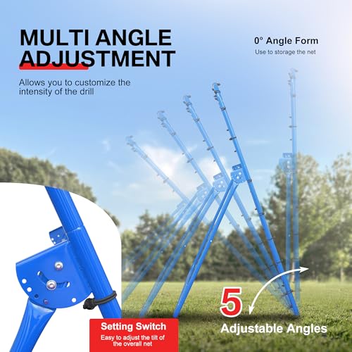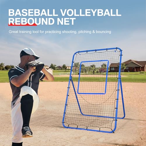 - IMPROVE YOUR SKILL - BALWONER pitch back rebounder net is a versatile tool to improve skills in ball sports such as hockey, lacrosse, baseball, softball, volleyball, soccer etc; Good for pitching, throwing, and fielding practice, DURABLE MATERIAL - Made of high-grade powder coated steel frame with tough, weather-resistant netting, and heavy-duty bungees that ensure durability in the face of intense training sessions and outdoor conditions; Comes with 4 metal stakes to keep it in place, perfect for both indoor and outdoor practice, EASY TO ASSEMBLE - The pitchback rebounder can be installed effortlessly in 15 minutes by following the manual instruction included; No extra tools are needed; The quick and easy assembly design lets you take practice anytime anywhere, ADJUSTABLE ANGLES - Features an 5 angles setting switch on the side, makes it easy to adjust the tilt of the overall net, and allows you to customize the intensity of the drill; The 5th setting is designed for storage, allows the rebounder to lie flat, making it convenient to stow away when not in use, LARGE REBOUND AREA - The receiving area of this rebound net is about 6 x 4 feet, offering a substantial rebounding surface; The blue target ribbon offers an accurate strike zone help you to improve pitching accuracy; Convenient for you to practice pitching and work at hitting the strike zone