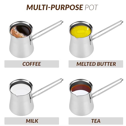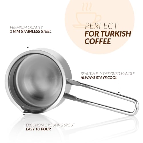 - LASTING QUALITY - This stainless steel briki coffee pot is made to last. No more rusting copper! The sturdy handle stays cool to the touch, so you can pour your hot beverage without burning yourself. Made with solid stainless steel that lasts forever., COMPATIBILITY - Suitable for gas, electric coil, and ceramic stovetops - heats quickly and evenly. Not compatible with induction cooktops., BEAUTIFUL DESIGN - Show off your new greek briki coffee pot with pride! This beautiful piece is designed to be used as a decorative item while brewing coffee or tea and still holds the same functionality of any other traditional Turkish coffee pot., MULTI-PURPOSE - Add a unique touch to your kitchen with this modern design. More than a coffee maker. Many uses including frothing milk for lattes, hot chocolate and brewing tea. Even use it to warm honey, melt butter and coconut oil or make sauces!, BREW YOUR FAVORITE COFFEE - This greek coffee maker brews your favorite coffee with ease and has a capacity of 24 ounce (720ml). You will be able to share the coffee love with friends and family. Brews 4-6 espresso with ease., SATISFACTION GUARANTEE - Our Turkish Coffee Pots are made from the highest quality materials available and are designed to last for years. We are so confident that you will love this product, we're offering a 1 Year Satisfaction Guarantee.
