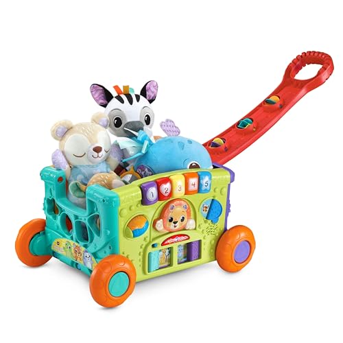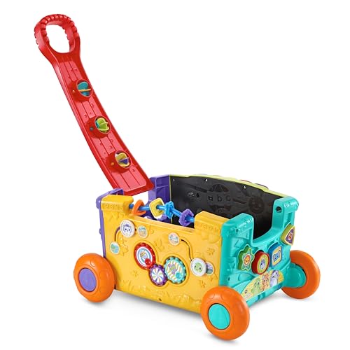- A wagon full of wonders! Each side contains activities like shape sorting, gear spinners, activity keys, mazes, peek-a-boo doors and more, Pile in favorite toys, snacks and items for little adventurers to take with them as they roll out and explore, Pushing or pulling the wagon rewards kiddos with cheerful music and sound effects to enhance playtime, Fold over the handle for easy storage or to play with the colorful spinners, adding a bonus fifth side to the wagon!, Intended for ages 12-36 months; requires 2 AA batteries; batteries included for demo purposes only; new batteries recommended for regular use