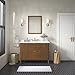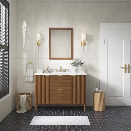- OVE Decors gabi 48-in warm walnut undermount single sink bathroom vanity with white engineered marble countertop for a scandinavian look, Warm walnut finish vanity with brushed gold hardware included, white engineered marble countertop with straight edge and removable backsplash, Features a 20.28-in x 15.16-in rectangular undermount sink with overflow, as well as pre-drilled holes for an 8-in widespread faucet - faucet not included, 2 soft-closing doors with 2 adjustable interior shelves plus 2 double-deep drawers to store supplies out of sight, Unique tamboured doors make a stylish statement