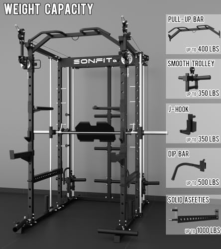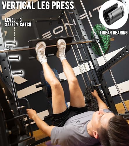 - 【11-In-1 Home Gym Station】E5 smith machine combines Power Cage/Functional Trainer/Cable Crossover/Two Lat Pull down Station/ Smith Machine /Vertical Leg Press/Chin Station /Dip Station /Core trainer/Landmine Station /Suspension Trainer. The guide rails (premium solid steel) deliver ultra-smooth movement with bearings during the workouts, as well as safe lock and release mechanics and safety arms allowing the users to max out their training safely, 【Vertical Leg Press】Attached and detached smith safety pin make the vertical leg press more smooth. The E5 smith machine comes complete with an array of accessories, including a Landmine, T-bar, Dip Handles, J-hooks, Safety Spotter Arms, Front Spotter Arms, Band Peg, two Lat Pull Down handles, Tricep rope, leg press plate attachment and a Rowing Footplate. These additions significantly expand the machine's capabilities, delivering a comprehensive and varied home gym experience to users, 【With Cable Crossover Machine】The home gym squat cage is equipped with PU cables and a pulley system to ensure reliable performance. With 16 adjustable height positions, it can cater to various training needs such as fly, lat pull down, lifting, curls, rows, and more., 【Widened Safety Training Frame】Our power rack home gym with cable crossover machine boasts a widened design and heavy duty steel core structure, offering you a stable and spacious training platform. Whether it's strength training, flexibility exercises, or balance workouts, almost all types of training movements can be performed within this multifunctional frame. Our design focuses not only on practicality but also on safety, ensuring unparalleled protection during your workouts