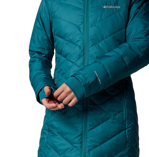 - OMNI-HEAT: Our patented Heat Reflective lining provides the ultimate hand warmth management for outdoor performance. This interior lining consists of our metallic dot pattern designed to retain heat, while the breathable fabric dissipates hand moisture., 100% SYNTHETIC DOWN INSULATION: The down-style baffling is flexible at all the right points, providing additional air-loft, versatile fit, and maximum warmth and enjoyment., CLASSIC FIT: This women's water resistant jacket features a long-line classic fit for comfortable warmth and protection during days outdoors., HANDY FEATURES: Long form featuring a plush fleece lined hood and collar, a two-way center-front zipper for total adjustability, an interior security pocket, zippered hand pockets, and comfort cuffs with thumb holes to keep hands warm on any chilly day., BUILT TO LAST: Columbia’s attention to detail is what sets our apparel apart. Specifying only the highest quality materials, expert stitching and craftsmanship. This is a long-lasting jacket you will enjoy for seasons to come.