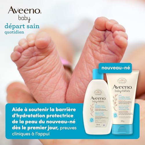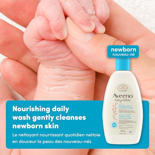 - Cleanse baby's delicate skin from day one with Aveeno Baby Daily Healthy Start Newborn Wash.This hypoallergenic wash gently cleanses delicate newborn skin. Comes with one 236-millilitre bottle of body wash., Aveeno Baby Daily Healthy Start Newborn Wash is made with prebiotic oat and rich emollients. The mild baby wash is gentle on newborn skin from Day 1., Specially formulated for delicate newborn baby’s skin, this daily healthy newborn wash cleanses while preserving the skin’s moisture barrier. To use, dispense onto wet washcloth or hands, gently rub to produce creamy lather. Rinse thoroughly. This tear-free wash leaves baby's skin clean and feeling moisturized—not drying to baby skin., This daily wash is pH-balanced, fragrance-free, paraben-free, soap-free, and phthalate-free. The cleansing baby wash is made by Aveeno, a dermatologist-recommended and pediatrician-recommended skincare brand for over 70 years., After cleansing, apply Aveeno Baby Daily Healthy Start Newborn Balm to support baby's natural moisture barrier. This product comes with one 236-millilitre bottle of fragrance-free body wash.