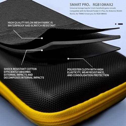 - COMPATIBLE : 5 inch handheld console universal storage bag, compatible with for 3 3 Plus, for RG505 RG552, for TRIMUI Smart pro, for RGB10MAX2., EVA MATERIAL: The handheld console case is made of resistant and premium EVA material, guards your game console from damage and accidental scratches., PROTECTIVE: This handheld console carrying case features a hardened outer shell that is scratch, shock, and drop resistant, and a soft inner liner that provides full guard., SUITABLE CAPACITY: The retro game handheld console case is compact in size and easy to carry, but offers enough space to hold your console and memory cards., MESH POCKET DESIGN: This game console storage bag is designed with an internal mesh pocket for storing small items such as charging cables, data cables and more.