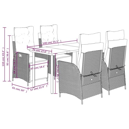 - 【Elegant Glass Table】: The garden dining set includes a stylish table with a tempered glass top, enhancing your outdoor space with a touch of elegance and easy-to-clean surface, 【Material & Design】: This garden dining set features durable PE rattan, a synthetic material resembling natural rattan, ensuring lightweight and low-maintenance use, perfect for outdoor relaxation and dining, 【Set Components】: Delivered with one rectangular table and four reclining chairs, each having a maximum load capacity of 110 kg and UV resistance, making this dining set suitable for patios and decks, 【Comfort & Cushions】: Enjoy a comfortable seating experience with this outdoor furniture set that includes thickly padded cushions featuring removable and washable covers for easy maintenance, 【Adjustable Reclining】: The chairs come with an adjustable backrest and footrest, providing customizable seating positions for extra comfort, making this patio set ideal for your garden or backyard