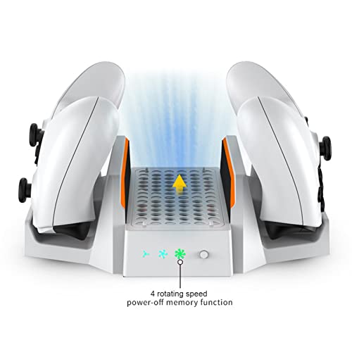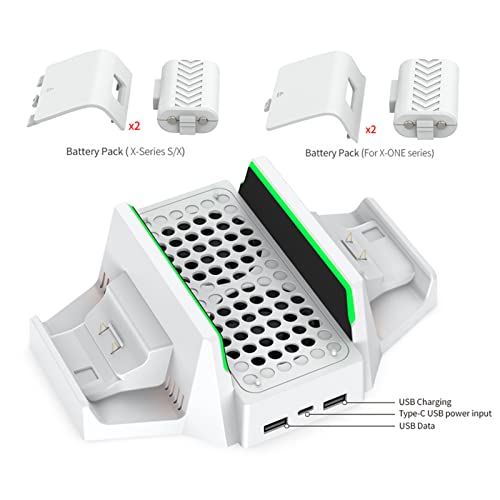 - APPLICABLE MODELS: Game console cooling stand is compatible with for X BOX Series S consoles. Two built in high speed fans speed up the air flow inside the for X BOX Series S for cooling purposes., 4 LEVEL ADJUSTABLE SPEED: Game console cooling stand supports four speed fan switching (fast, medium, slow, and OFF) and an A type USB 2.0 data transfer interface, which is mainly used to connect to a joystick for gaming., SMART CHIP CONTROL: Game console radiator is controlled by a smart chip and has a power off memory function, as well as a gear indicator with fast, medium and slow light switching, and an OFF gear with all lights off., USB PORT POWER SUPPLY: Game console cooling stand is powered by the USB port on the X BOX Series S, so there is no need to configure a separate power supply. Equipped with 800nAh dual battery pack., DUAL CHARGING STATION: Cooling stand can charge two for X BOX controllers at the same time, the corresponding charging guide will turn to red light is always on when charging, after a full charge shows green light is always on status.