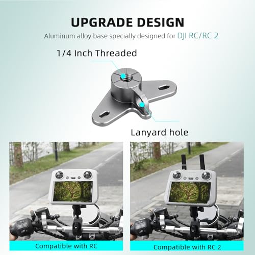- UPGRADED DESIGN: This aluminum alloy adapter base is specifically designed for the DJI RC 2 RC remote control, with a sleek, aircraft-shaped design that offers both durability and usability. Featuring a 1/4 inch screw hole and a lanyard hole, Using a lightweight and mini design that remote control can be easily stored in a bag without the need for removal., SAFETY AND STABILITY: Our bike mounts have excellent safety and stability. By increasing the area at the 1/4 screw hole of the adapter base and upgrading the nut, it ensures a firm fixation and is not easy to fall off. In addition, the ABS anti-slip pads on the bracket clamps can increase friction and prevent shaking while riding, further improving shooting stability., WIDE CLAMPING RANGE: The clamp has a clamping range of 2.5cm to 4cm (0.98 to 1.57in), with a good gripping power, it can be mounted on motorbike handlebars, bicycle handlebars, boat rails, road poles, tree trunks, fishing poles, selfie sticks, tables, skateboards and so on., EASY TO SET UP AND REMOVE : Our bike mounts feature a dual ball head design with 360 degree rotation on both the top and bottom. This feature allows you to shoot from any angle and is quick to set up and take down, allowing you to effortlessly install or change equipment as needed., UNIVERSAL COMPATIBILITY - Our bike mount with 1/4 inch ball head and included sports camera adapter and adapter base is compatible with DJI RC RC 2 RC remote control, Osmo Pocket 3 2 Action 3 4 , Insta360 X4 X3 X2 Ace Pro One R RS Go 3 GO 3S, for GoPro Max Mini Hero 12 11 10 9 8 7 6 5 Black Hero 4 3 and other sports cameras.