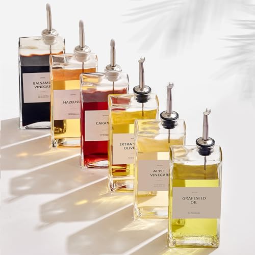 - 【Multifunctional Stainless Steel Spout】The oil dispenser contains 2 types of stainless steel drip-free pourer with different tops, one with a silicone dust-proof top to help seal and prevent spills; the flip top is dust-proof but at the same time keeps pouring oil easy, no need for other extras action. Both outlets have air circulation backflow spill prevention and rubber cork for good pouring and sealing., 【Exquisite Quality & Nice Performances】: The cooking oil container is made of superior quality BPA-free glass, combing a shatterproof body with a 304 stainless steel spout, rustproof, and lightweight, ensuring controlled liquid flow, preventing any spillage and leakages from staining your countertop. Moreover, each pouring spout has a seal ring, and the cap is fully closed when not in use, keeping your liquid ingredients fresh and original., 【Thoughtful Design & Effortless Convenience】: Every oil and vinegar dispenser bottle set comes with 2 olive oil dispenser bottles, 2 weighted self-closing spouts, 2 replacement spouts, 1 collapsible funnels, 1 cleaning brush and 40 labels. The oil dispensers for the kitchen are also practical for holding or dispensing oil, vinegar, soy sauce, cooking wine, or mouthwash. This 2 pack oil dispensing set meets most of your daily needs and is prefect to share with your friends and families., 【A Good Helper to Organize Your Kitchen】: The 36 printed labels and 4 blank ones are oil-proof, non-rolling, and tear-resistant, making it easy to differentiate your seasonings, helping you find the right one while you are busy cooking. Also, the food-grade funnels solve the filling and refilling issue, making everything clean and neat, and the brush allows you to clean the oil decanter thoroughly. Last, the olive oil container set is also ideal for BBQs, picnics, camping, etc., 【100% Risk-Free Service】: The products are cleaned and disinfected before leaving the factory, and we use impact-resistant peal cotton for packaging to provide utmost protection for each oil dispenser set. It is an optimal gift for occasions such as housewarming, Mother’s Day, or Christmas. If you have any issues with the oil bottles you receive, please feel free to contact us, and we will give you a satisfactory solution for you.