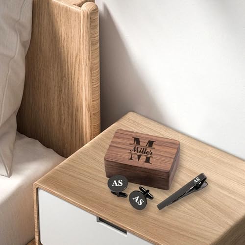 - PERFECT CUSTOMIZED GIFT: Whether it's cufflinks, tie clips, or a wooden box, we offer personalized and custom designs. You can choose to customize them with your own or someone else's name or special message, making them exclusive accessories that will remain cherished keepsakes even as time passes., PRODUCT SIZE: Walnut Wood Box Size: 2.5*1.6*1 inches in size (L*H*W) , Cufflinks Diameter: 20 mm (0.78 inches), Cufflinks Thickness: 3 mm (0.11 inches), Tie Clip Size: Length 58 mm (2.28 inches), Width 6 mm (0.30 inches), HIGH QUALITY MATERIALS: These cufflinks and tie clips are crafted from premium stainless steel, ensuring durability. The wooden box is made from classic walnut wood to preserve the accessories for years to come. Their timeless charm is enhanced by a classic electroplated finish on the cufflinks, and their sturdy construction ensures they can be worn repeatedly without losing their shine. The cufflinks feature a secure fastening design, while the tie clip effortlessly holds the tie in place., SUITABLE FOR ALL OCCASIONS: Weddings, anniversaries, birthdays, conferences, office wear, speeches, formal dinners, parties, and exquisite gifts. Personalize your look with cufflinks and tie clips engraved with initials, perfect for weddings, business events, or any special occasion., UNFORGETTABLE GIFT: Whether you're looking for an unforgettable gift for the groom's groomsmen or simply a daily memento for men, our cufflinks and tie clip set is the perfect choice. Featuring unique design, personalized names, premium materials, and a gift-ready wooden box, it's the perfect way to express your love and ensure your loved ones feel truly valued on your special day.