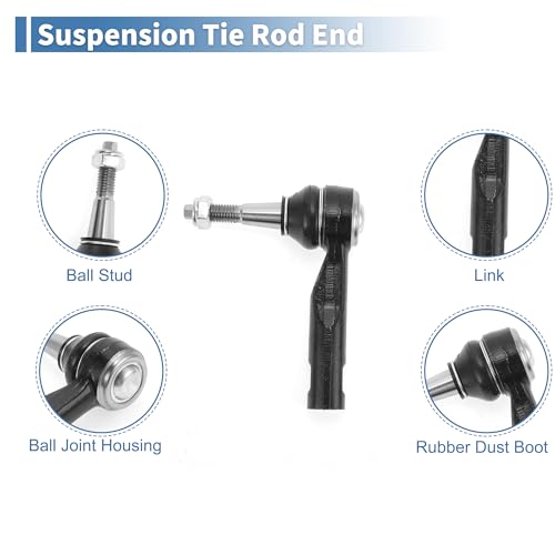 - FITMENT: The Tie Rod End Links Kit is fit for Chevrolet Equinox 2010-2017 2.4L, for GMC Terrain 2010-2017 2.4L, OE Number:EV800648/ES800640; PLACEMENT ON VEHICLE: Front, Inner, Outer, Left, Right, FUNCTION: Steering Tie Rod is used to cushion the impact transmitted from the uneven road surface to the frame or the body, and to reduce the vibration generated to ensure the smooth running of the vehicle., PACKAGE INCLUDES: 2 x Front Outer Tie Rod Ends, 2 x Front Inner Tie Rod Ends, 2 x Tie Rod Boot, INSTALLATION: Manual not included, you can loosen the pinch nut and remove the cotter pin, remove the castle nut and the outer tie rod end, then remove the boot and remove the inner tie rod end. At last, replace a new tie rod and install it back according to the method of disassembly.