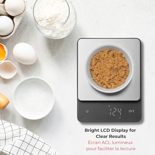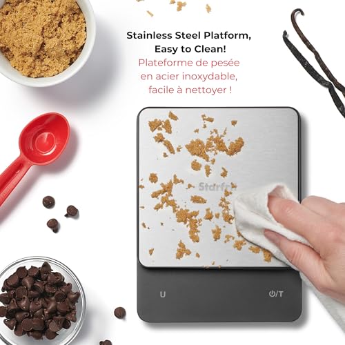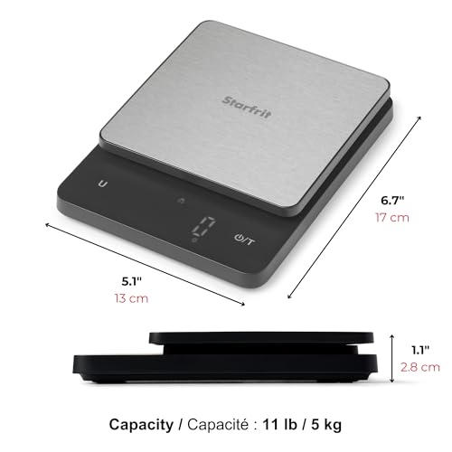 - The Starfrit Digital Kitchen Scale has a durable stainless steel with fingerprint-resistant finish platform for easy cleaning., The scale measures up to 11 lb (5 kg), suitable for a variety of ingredients., It provides an accuracy of 0.1 oz (1 g), ensuring precise measurements., Measures liquid volume for accurate milk and water measurements., Features automatic conversion between imperial and metric units., Zero and tare functions ensure precise measurements in any container., Features low battery and overload indicators for continuous use., Auto-off function activates after two minutes of inactivity to conserve battery or manual-off option for extended use., 3 x AAA batteries included.