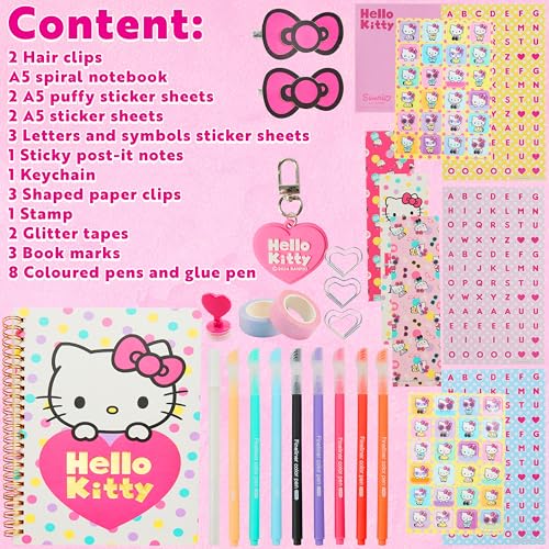 - Hello Kitty DIY Journal - Inspire creativity with this DIY journal kit! Including a blank notebook, stickers, glitter tapes, pens, and more - everything needed to design and personalise their own Kawaii journal, Official Hello Kitty Merchandise - This cute stationary is officially licensed merchandise, perfect for fans of Hello Kitty or the Kawaii aesthetic who want to create their own unique journal!, Complete Set - This stationery set for girls includes an A5 notebook with blank pages, plus accessories like hair clips, stickers, paper clips, fineliner pens, and more! See images for full contents, Encourage Creativity - This DIY journal kit encourages self-expression and creativity! It’s perfect for kids to explore their artistic side while crafting a journal they’ll cherish and love using, Hello Kitty Gifts for Girls & Teens - This journal set is an ideal present for birthdays, Christmas, or special occasions, offering endless fun and a chance to create a unique keepsake!