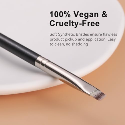 - Angled Eyeliner & Eyebrow Brush - The angled design allows for effortless and accurate application of gel or powder eyeliner, while also providing the precision needed for shaping and filling in brows, Ultra Soft Synthetic Bristles - The brush features soft synthetic bristles that gently glide over your skin without irritating it. These high-quality bristles ensure flawless product pickup and application, whether you’re using powder, cream, or liquid cosmetic, Ergonomic Design for Comfortable Use - The thoughtfully designed handle fits comfortably in your hand, providing you with a secure grip for precise control during application. This ergonomic feature minimizes hand fatigue, making it perfect for long makeup sessions or professional use, Secure Metal Ferrule Connection - The bristles are securely attached to the handle with a high qulity metal ferrule, ensuring long-lasting durability and preventing any shedding during use. This strong connection ensure that the bristles stay intact for flawless application every time, making this brush a dependable choice for all your makeup needs, Easy to Clean and Maintain - Our makeup brush is designed for easy cleaning, ensuring you can maintain its pristine condition without hassle. Simply clean the bristles with a gentle cleanser, and they’ll remain as soft and effective as the day you bought it, ensuring a lifetime of flawless makeup application