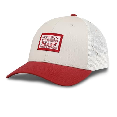 - CLASSIC STYLE: The Levi's Men's Two-Tone Trucker Hat is a bold and stylish accessory that adds a pop of color to any casual outfit., DESIGN: This classic trucker hat features a structured white front panel and breathable mesh backing, with a pop of red for the iconic Levi's logo and brim., ADJUSTABLE FIT: With an adjustable snap back strap, this trucker hat offers a customizable fit for all head sizes. Whether you're running errands or hanging out with friends, it provides comfort and secure fit., VERSATILE STYLE: Whether you're pairing it with jeans and a t-shirt for a casual day out or wearing it to a weekend event, this hat's versatile design complements a variety of looks, making it a must-have accessory.