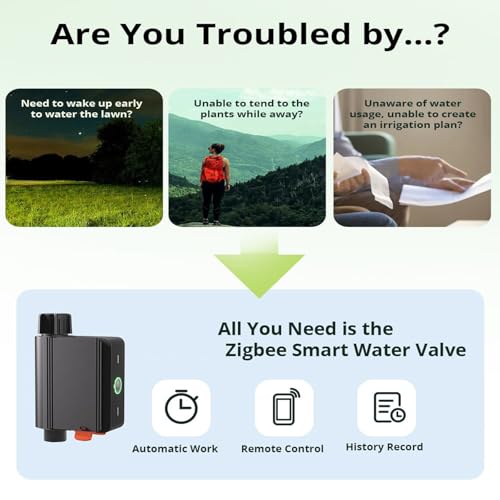 - 【Easy Installation】Simply connect the Zigbee Smart Water Valve between the faucet and the hose to quickly upgrade your irrigation system in just three minutes, automatically watering your lawn, garden, vegetable patch, and more., 【Customize Suitable Irrigation Plans】The Zigbee Smart Water Valve features schedule mode and capacity mode, supporting both single and cyclic irrigation. Allow you to provide more targeted care for your home plants or crops., 【6-month Historical Data Hold】Support checking up to 180 days of water usage and duration through the app. Understand daily, weekly, or monthly data to better control irrigation amounts and save more on water bills., 【Zigbee 3.0 Compatible】 Integrates with Zigbee hubs utilizing the Zigbee 3.0 protocol, such as eWeLink NSPanel Pro, eWeLink iHost, eWeLink ZB Bridge-P(Don't Support eWeLink ZBBridge), eWeLink ZB Bridge-U, eWeLink ZBDongle-E/-P, Echo Plus 2nd…, 【Support Open-source Platforms】The Zigbee Smart Water Valve Integrates into open-source platforms via ZBDongle-P or ZBDongle-E to perform automatic irrigation functions., Note1: The Zigbee Hub is needed. Note 2: Batteries not included. Click to view the differences between NH and BSP (It is for reference only, please choose based on the thread standard you actually use).