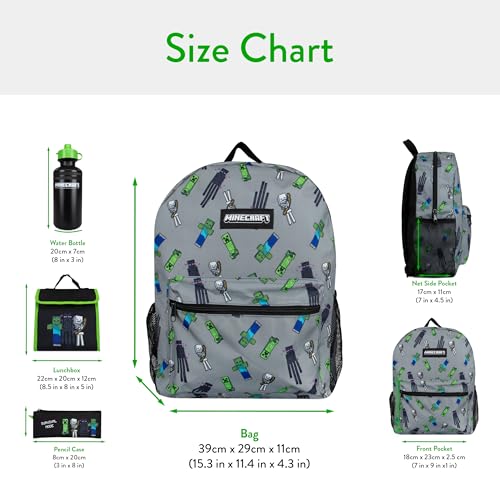 - 4 Piece Kids Minecraft Backpack Set: Ignite your little gamer’s imagination with this awesome Minecraft backpack set, featuring a gaming backpack and lunch box! With an all-over print of iconic Minecraft Creeper, Zombie, Skeleton, and Enderman; this black and gray Minecraft school bag set is perfect for any gaming fanatic., Zipped And Spacious Compartments: This Minecraft backpack for boys includes zippered front and main compartments, plus two handy mesh side pockets for their Minecraft water bottle and snacks. Ideal for keeping all their back-to-school supplies safe and secure. Approx Dimensions: Bag: 41 x 30 x 15 cm. Lunch Bag: 22 x 20 x 12 cm. Pencil Case: 8 x 20 x 1 cm., Comfy Adjustable Straps: Boasting gray adjustable shoulder straps, this super cool boys backpack is designed to keep your little one comfy and stylish. Paired with a matching Minecraft pencil case and water bottle, this kids’ school backpack set is a must-have for fans of Minecraft and gaming., Awesome Minecraft Gifts For Boys: Whether they're heading back to school or embarking on an unforgettable adventure, this boys backpack and lunch box set makes the perfect birthday gifts for boys, kids’ gifts, or a special Minecraft gift for any occasion., Official Minecraft Merchandise: Complete with a Minecraft pencil case, Minecraft water bottle, and a super cool Minecraft lunch bag; this Minecraft merch is essential for any young Minecraft fan. This gaming bag set is sure to have them ready to craft, mine, and create epic stories.