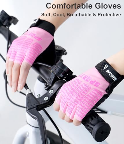 - Fingerless Bike Gloves: Made of Ice-silk fabric, which has good breathability, elasticity & hygroscopicity. Much cool & comfortable while biking in hot summer, let the fingers breath but still protect hand palms., Protect Kids Hands: With non-slip palms design, these gloves are great in protecting hands & are still grippy. Avoid hand scratch and relief from calluses. Velcro closures allow for wrist tightening, and easy to put on or take off the gloves., Kids Size Gloves: Two sizes available, small for ages 4-7, gloves palm width is about 3 inches; medium for ages 8-10, gloves palm width is about 3.2 inches., Kids Sports Gloves: Designed for bike riding, also suitable for other children's sports and activities, such as climbing, monkey bars, sailing, fishing, golfing, motorcycling, etc., Cute Gloves for Girls: Pink, Green, Orange for your choice, put on these gloves, play on the monkey bars feels lightweight and protective. Perfect gift for daughter, granddaughter, niece or other little girls who love princess.