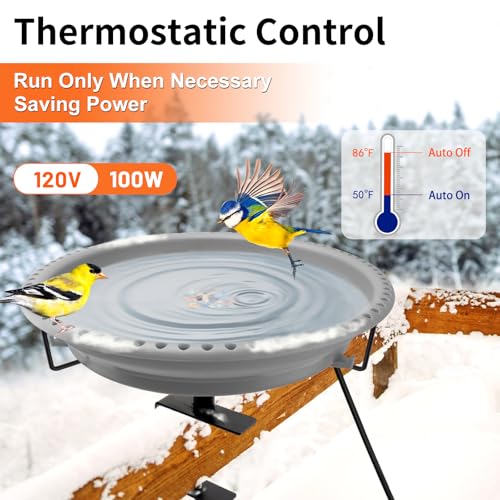 - 【100W Upgraded Heated Bird Bath】Newly upgraded 120V 100W winter heated bird baths for outdoors can keep the birdbath from freezing in winter; Power is upgraded to 100W with higher thermal conductivity for rapid deicing and heating, ensuring your birds can enjoy warm water in minutes; Allowing birds to play in warm water during the winter months, 【Intelligent Thermostatic Controlled】Built-in constant temperature sensor, thermostatically controlled, bird bath heater will automatically run only when needed, stops running when not needed, safer and more energy saving! Providing fresh flowing mild water for birds outdoors in winter; Attract more birds to your yard to drink and bathe, bring vivid to the backyard, 【Premium Material & Safe】Heated bird bath for deck railing made of durable plastic bowls and heavy-duty metal clamp, birds can firmly grasp the small holes on the edge and will not easily slipped; All the heating element that is safely enclosed, make sure the safe of birds, provide better care for your birds, 【Easy to Install & Clean】No tools are needed, installation is very easy and can be done in minutes; Equipped with an adjustable clamp (up to 3.5 inches) that can be mounted on decks railing; Very easy to clean and fill, just take the bowl out of the ring holder when you notice bird droppings, dirt, or dust buildup accumulating on the bird bath bowl, 【Best Gifts for Feathered Friends】The heated bird bath deck mounted can be used to provide gentle water for your birds during the cold season, let your bird friend have happy winter days; You will be very relaxing to watch varieties of birds coming to drink, bathe or a moment of rest in the water during a beautiful snow storm