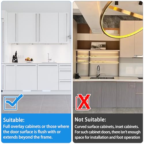 - 【WILL IT FIT?】Fits most cabinets but not all, please check cabinet specifications carefully before purchasing to ensure compatibility. Only suitable for cabinets where the door fronts and frame are completely flush or almost completely flush, ensuring ample space for foot operation after installation. Not suitable for recessed/inset cabinets., 【Hands-Free Design】When your hands are full or dirty and it is not convenient to open the cabinet door, our product can help you solve this problem. You can easily open the cabinet door with your feet., 【Convenience】You only need to gently press the control lever with your foot to open the garbage drawer. No more bending over or touching the dirty lid., 【Two installation methods】After ensuring that there is no dirt or dust, align with the middle position below the cabinet door and use double-sided tape to attach the handleless handle to the back of the cabinet; Or install it by drilling holes with screws., 【Sturdy and durable】Made of high quality metal, its sturdy construction ensures durability and longevity. Sleek and compact, it mounts easily to cabinet doors.