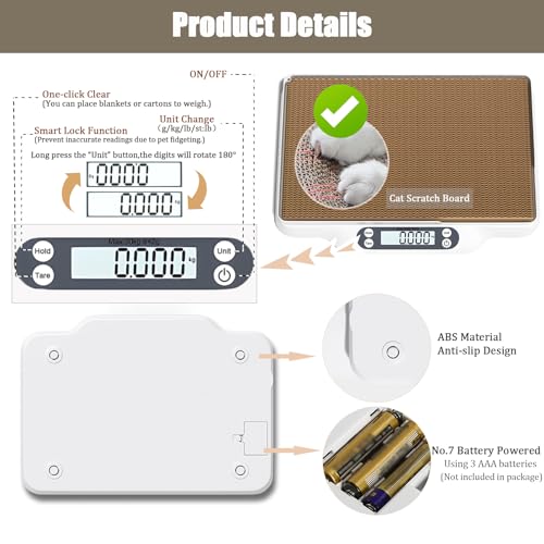 - Multifunctional Pet Scale : Our digital pet scale is designed for newborn or small animals like kittens, puppies, hamsters, rabbits, parrots, turtles, and chameleons. It can also be used as a kitchen scale or pet food scale to weigh pet food and assess growth accurately. Comes with a cat scratcher and fun cat toy to engage your pet, Appropriate Size : Two trays measure 14.8 inches (38 cm)/27.5inches (70cm),and the scale can measure up to 66 lbs. Suitable for pets or babies weighing less than 66 lbs, Quality Material & Design : Our puppy scale features a safe and comfortable design, made with eco-friendly ABS material. It consists of tray and base, both detachable for flexible weighing. Its easy to assemble and offers great versatility, Digital Scales with 2 Trays : Our scales with 2 trays, removable, free combination. Can be combined into a pet weight scale for kittens, puppies. It can also be combined into a baby weight scale for infants. It can also be used for kitchen and pet food weighing. Realize multi-functional application, Accurate Measurements : Our LCD digital pet scale measures in g/kg/lb/st:lb. With a minimum weight of 40 grams, accuracy of 2 grams, and a maximum weight of 66 pounds, its perfect for tracking your pets weight and health. Can also be used in the kitchen for accurate food measurements, LCD Screen : Our electronic scale sports a large LCD screen with white backlight, making it readable even in the dark. Long press the unit button to rotate the screen reading by 180 degrees for convenient viewing from any angle.For active pets, press the hold button to lock the data for an accurate reading despite pet movement. You can also wait for the pet to fall asleep before placing them on the scale