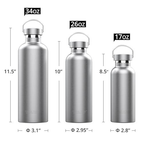- 【Double Wall Vacuum Insulated】The vacuum insulated water bottle keeps your drinks hot for up to 12 hours and cold for 24 hours. Note:To keep your drink warmer or cooler for longer, pour hot (or cold) water into the body and let it sit for a minute or two to allow the body to heat up (or cool down). Once the water bottle is preheated (or pre-cooled), pour off the hot (or cold) water and refill with hot (or cold) water., 【Safety for Drinking】Say no to plastic water bottles. The insulated water bottle is made of BPA-free food-grade 18/8 stainless steel that protects the bottle from oxidation, won't produce unwanted flavors, while the deep groove seal with a plastic O-ring inside ensures that the bottle is safe for you to use and drink., 【Wide Mouth Design &Easy to Clean】Our insulated double wall water bottle features a wide mouth design with a wide opening for easy addition of ice cubes or filling with fruit. You can also add coffee, tea, hot beverages or other beverages. Thanks to its large neck, you can easily clean the inside of this stainless steel bottle to make sure they are clean., 【Hydration on the Go】The lid comes with a carrying handle, load resistant and easy to carry, giving you a portable trip. A versatile hiking clasp allows you to clip the bottle to your bag and keep it within reach at all times. The stainless steel water bottles are ergonomically shaped to make one-handed use a breeze., 【Thoughtful & Leak Proof Lids Design】Stainless steel cover that withstands frequent drops without breaking. The specially designed non-insulated stainless steel cover is leak-proof and features heavy-duty threads that help maintain a solid connection. Its high-quality silicone ring ensures that it won't leak whether tipped over or shaken, the camping water bottle can be placed in a bag without worrying about getting dirty.