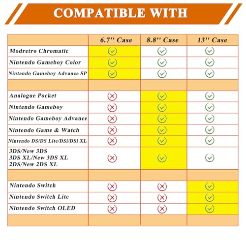- 【Keep Your Valuable Game Console Protected】:You can customize a perfectly fitting protective case for your game console by yourself. This 6.7'' case is perfectly compatible with Modretro Chromatic/Nintendo Gameboy Color/Nintendo Gameboy Advance SP handheld game console (Case Only)., 【Customizable Foam Design】- You can use our customizable foam to DIY a "home" for your beloved handheld game console, which can perfectly match your handheld game console. The foam can effectively buffer external shocks, protecting the game console from impacts and scratches., 【Premium Material】: This Hard Case With Customizable Foam is made of durable high-grade hard EVA material and woven fabric, excellent touch, soft protection of content. If accidentally dropped, the hard case and sofe foam can effectively absorb shock and reduce damage, protecting the game console from dust, dirt, impacts and scratches., 【Secure Zipper Mesh 】: The zippered mesh bag of the hard case can store other game console accessories, such as game cartridges, charging cables, etc., to prevent them from falling., 【Service Guarantee】: Note: For sale is the case only, not included with game console. We're confident you'll appreciate the craftsmanship and attention to detail that goes into creating this hard case. Each one comes backed by our No Hassle 1 Year Replacement Warranty.
