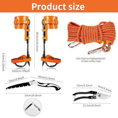 - Package Include: This tree climbing equipment package includes 1 x pair of tree climbing gear, 1x protective belt, 1x flip line for tree climbing, 1x rope, 2 x foot straps, 2 x ankle straps, 1 x pair of gloves, 2 x spike spurs protector, 1 x hexagon wrench, 4 x replacement screws and 1 x throwing rope bag. The complete tree climbing kit provides you with considerate service, accompanying your climbing journey, Superior Quality: These climbing spurs are made of premium 304 stainless steel through high-temperature quenched and precision welded, more sturdy and not easily deformed, ensuring excellent grip and stability. Leather protectors are made of premium cowhide mechanically stitched for firmly secured, providing comfortable climbing experience, Ergonomic Design: The climbing spikes pads are thickened and widened, more ergonomic and fit foot structure, minimize foot friction as much as possible. The elastic sponge pad inside the rock climbing gear has a soft and comfortable touch, reducing the fatigue of high-altitude operations and ensuring excellent completion of works, Ergonomic Design: The climbing spikes pads are thickened and widened, more ergonomic and fit foot structure, minimize foot friction as much as possible. The elastic sponge pad inside the rock climbing gear has a soft and comfortable touch, reducing the fatigue of high-altitude operations and ensuring excellent completion of works, Widely Used: The tree climbing spikes for tree work are very practical, suitable for multiple applications like tree climbing, outdoor sports, rock climbing, picking fruits, logging, hunting, etc. And it is an ideal gift for friends and relatives on occasions like birthday, housewarming, Christmas, Thanksgiving, New Year, etc