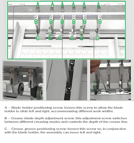 - Paper cutter folding machine equipped with 2x creasing blades (creasing width 1.0/1.2/1.5mm), 2x press rubber wheels, 1x perforating blade, and 1x slitting blade, allowing easy adjustment of the applied pressure and depth, Paper perforator tool is ideal for creasing business card, photo, greeting card, color page, cover, etc. and perforating and cutting documents and tickets, suitable 60-500gsm papers, kraft papers or cardboards, Letter paper folding machine designed with dual T-shaped paper feeding guides to help feed the workpieces securely with high precision, feeding width up to 18-inch, aided with clearly marked cm & inch scales, Creasing cutting perforation tool built with a premium motor and big gearwheel drive belt to feed at a constant and stable speed can create full and continuous creases without break or deviation, a single or multiple creases at one time, Paper folding machine comes with an extended feeder for optional use and two long legs to help stabilize when necessary, and the hollowed-out metal cover to both heat dissipation and safety concerns