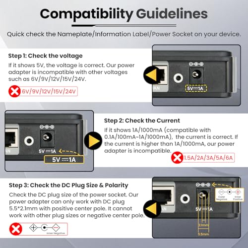 - 【Specifications】AC Input: 100-240V 50/60Hz; DC Output: 5V 1A 5Wmax; DC Interface Size: 5.5*2.1mm; DC Polarity: Center Positive(+); Outer Negative(-); 6ft/1.8m Long Cord for home, work, school, and travel. Compact size with horizontal plug for space-saving, 【Wide Application】Compatible with DC 5V devices that draw less than 1A (compatible with 0.1A~1A). Ideal for powering CCTV Security Camera, Pet Feeder, Router, Digital Picture Frames, TV Box, Digital Clocks, Raspberry Pi, Baby Monitors, Turntables, Record Player, Bluetooth Speaker, Soundbar, LAN Phones, External Hard Drive, Wireless Receivers, Games Consoles, Laptop Cooler, Hard Disk Box, Electrical Toys, Graco Swing, Mini Fan, LED Lights, Webcam, etc. Good for PET-CHEWED cord backup, 【Safe & Reliable】UL Listed, FCC Certified, RoHS Approved, Energy Efficiency Level VI. Built-in Multi-Protections: Over-current Protection, Over-temperature Protection, Over-voltage Protection, Over-load Protection, Short-circuit Protection, Surge Protection, it is safe, reliable and budget-friendly, 【Money-saving & Durable】Level VI Energy Efficiency helps save 15%-20% Electricity Charge than Level V. With Intelligent microchip, premium pure copper wire core, superior PVC insulation jacket, solid flame-retardant PC & ABS shell, and firm connector, the power adapter delivers high power efficiency and durable for use, 【Warm Reminder】1) Package includes: 1 x 5V 1A Power Adapter. 2) It is a power supply adapter, NOT a charger. 3) It is non-waterproof, for indoor use only. 4) Please check the Voltage/Current/DC Plug Size/DC Polarity before purchasing