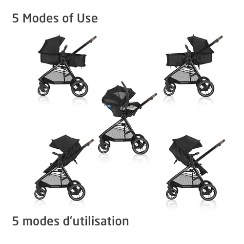 - [5 MODES OF USE] – Seamlessly transition from carriage mode to toddler stroller, with parent-facing and world-facing options at each stage. Pair with the included infant car seat for a complete travel system., [CANADA-READY DESIGN & WEATHER PROTECTION] – Built for city and country walks, with larger wheels for better handling on any terrain. Comes with an insulated boot cover and weather shield to keep your child cozy and protected in all climates., [ULTIMATE COMFORT & SAFETY] – Enjoy the benefits of an adjustable handle height, an extra-comfort inlay, and a bumper bar that swings to the side for easy access to the seat, keeping your little one secure and comfortable., [EXPANDABLE CANOPY & ALL-TERRAIN SUSPENSION] – A large, extendable canopy with a flip-out visor and peek-a-boo window offers enhanced coverage, while the 4-wheel suspension provides a smooth ride on bumpy roads., [EASY HANDLING & COMPACT STORAGE] – Simplify outings with a convenient one-handed fold and self-standing fold feature for compact, space-saving storage. Lockable swivel wheels ensure smooth navigation, even through heavy snow.