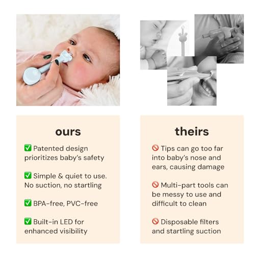 - Light Up Design With Two Changeable Tools - use the scoop-ended tool to remove dried boogers and clean ears and the loop-ended tool for sticky snot – all without waking baby or turning on a light. TO CLEAN: gently rinse with warm water. Do not sterilize., Versatile Dual-Ended Baby Essential - Engineered as a vital part of your baby must haves, oogiebear’s 2-in-1 ear and nose cleaner tackles both dried boogers and earwax with the scoop end, and sticky snot with the loop end. A safer, more effective alternative to traditional baby qtips, it’s a top pick for newborn essentials., Portable & Hygienic Baby Travel Essential - Designed for busy parents, oogiebear is lightweight, easy to clean, and a diaper bag essential, making it the perfect baby travel essential for on-the-spot nasal and ear cleaning to ensure your baby’s comfort anywhere., Simple & Efficient Cleaning Solution Among Baby Stuff - oogiebear stands out in your collection of baby stuff with its straightforward approach to nasal and ear cleaning, eliminating the need for uncomfortable suction tools, saline drops, or nasal aspirators. It simplifies hygiene routines, making it stress-free for both you and your baby., Doctor-Designed, Parent-Approved Baby Must-Haves - Created with expertise by a pharmacist and mother, oogiebear is a key item in diaper bag essentials and baby must haves, trusted by professionals and loved by parents. It promotes easier breathing and peaceful sleep, contributing to happier, healthier babies.