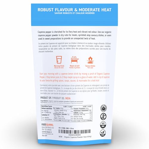 - FLAVOR EXPLOSION: Ignite your taste buds with our organic cayenne pepper powder! Each pinch packs a punch of heat, perfect for turning up the spice in any dish., CHEF'S SECRET: Elevate your culinary creations with the fiery kick of cayenne pepper organic powder. It’s the secret spice that professional chefs and home cooks adore., AUTHENTIC HEAT: Experience the authentic heat and flavor of cayenne pepper organic from the sun-soaked soils of India—no fillers, just pure spice., TRANSFORM ORDINARY DISHES: With a heat level of 25,000 SHU, our Cayenne Pepper Powder transforms ordinary dishes into extraordinary experiences with just a pinch., ORGANIC SPICE: Enjoy a pure, organic spice product with no fillers or MSG; always the best spice to refill your kitchen panty.