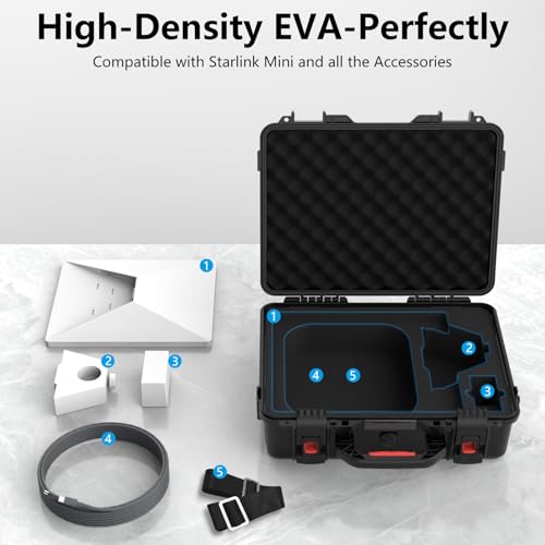 - Ultimate Protection for Starlink Mini: This Starlink mini case offers ample storage for your Starlink Mini Accessories, holding the dish, kickstand, power adapter, pipe adapter, and cables securely. Its rugged design ensures all-around protection during camping, hiking, and traveling., Durable Hard Shell Protection: Made of high-quality ABS material, this Starlink case resists shocks, scratches, drops, and compression. Ideal for outdoor adventurers, military personnel, and tech enthusiasts seeking durable gear., Custom-Fit Interior for Secure Storage: The high-density EVA foam interior is precision-cut to securely hold the Starlink Mini and its accessories, preventing movement and offering superior cushioning during transport., IP67 Waterproof and Dustproof Design: With IP67 certification, this case protects against water and dust, keeping your Starlink Mini safe in extreme outdoor conditions from RV trips to camping adventures., Portable and Secure Design: This Starlink case comes with a shoulder strap and a handle. You can wear it over your shoulder for easy, hands-free carrying or grab the handle for quick access, making it comfortable and convenient to carry while traveling.