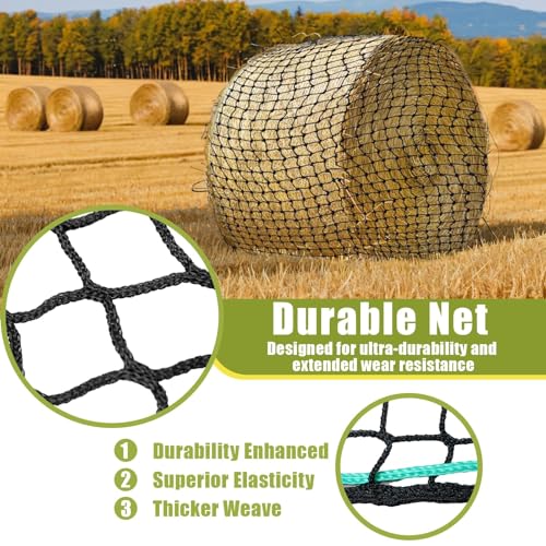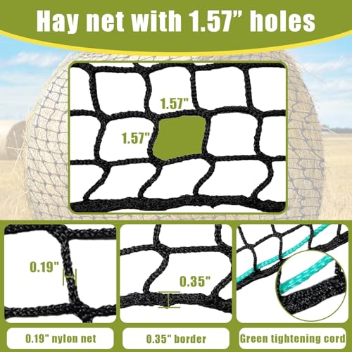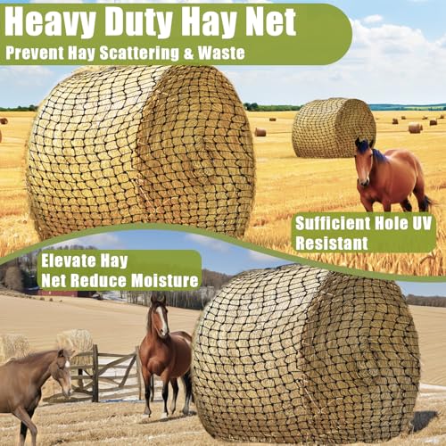 - 【Reduced Waste】Keep your hay bales neat and clean with our hay netting, designed to prevent hay from scattering and getting trampled. This helps save money, reduces waste, and minimizes the mess that can occur on the ground., 【Better Digestion】Our slow-feed hay net features a 3.98cm mesh, slowing down your horse's hay consumption to mimic natural grazing. This can improve digestion and help prevent issues like colic and ulcers. The knotless texture is gentle on your horse's mouth and reduces wear on their teeth, promoting a healthier feeding experience.Besides, we will also provide 20 self-locking rope straps, 66ft braided twine, Netting needle shuttle and storage bag., 【Sturdy and Durable】Crafted from high-quality PE material, our hay net is UV-resistant and built to withstand the elements. With a weight capacity of 2200 lbs, this durable hay net is designed for long-lasting use, making it a reliable choice for your feeding needs., 【Simple and Practical】 Filling the hay net is a breeze thanks to its wide openings, allowing easy use without the need for heavy equipment. Tighten the bales effortlessly to ensure secure feeding., 【 Easy Feeding】The tightly braided thread ensures durability, making feeding more convenient for you and enjoyable for your horses. Keep your horses happy and your environment cleaner with our efficient hay netting. Order now for hassle-free feeding!