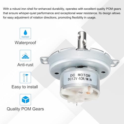 - This component are widely extensive application in the air deflection systems and oscillating mechanisms of 3D Printers, heating appliances, radiators, adjustable sun lamps, diverse display stands, DIY goods, light devices, and other domestic devices. Additionally, it is integral to the air guidance motors in a variety of air conditioners and the turntable drives in microwave ovens., Type: Gear Slow Speed Motor; Model: JS-50T;Voltage: 12V;Speed: 40RPM;Rated Power: 1-2W;Direction: CW/CCW(Forward rotation-CW clockwise; Reverse rotation-CCW counterclockwise);Shaft Screw Thread: M4;Hole Diameter: 3mm/0.12 Inch; Total Diameter: 64mm/ 2.51 Inch;Total Length: 53mm/2.08 Inch;Shaft Diameter: 7mm/ 0.28 Inch;Shaft Length: 15.5mm/0.61 Inch;In the package of: 1Pcs x Electric Gear Slow Speed Motor, The JS-50 DC geared motor, with a robust iron shell for enhanced durability, operates with excellent quality POM gears that ensure whisper-quiet performance and exceptional wear resistance. Its design allows for easy adjustment of rotation directions, promoting flexibility in usage. Known for its energy-saving capabilities, this motor is a reliable choice for a wide range of products, from electric fans to microwave ovens., Connect the motor to an appropriate power source, ensuring compliance with the motor's rated voltage and frequency requirements. Install the plastic gear motor in the desired location. Press the start button or switch to start the motor., Please select the speed and power you need and avoid putting fingers or other objects close to the running motor parts.