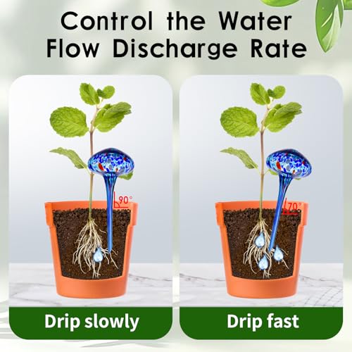 - 💧【Watering Bulbs for Plants】Each globe is made from high-quality, tempered glass, ensuring durability and longevity. Size: 9*20cm, Each large mushroom globe holds up to 170ml of water, providing a consistent water supply for 7 to 10 days, making it perfect for both indoor and outdoor plant care., 🌱【Easy Installation with Step-by-Step Guide】 Designed for simplicity, these watering globes are easy to install. Simply fill the globe with water, insert it into the soil at a 60-75 degree angle, and enjoy hassle-free watering. Perfect for apartments, gardens, patios, regardless of your skill level., 💧【𝗣𝗹𝗮𝗻𝘁 𝗪𝗮𝘁𝗲𝗿𝗶𝗻𝗴 𝗚𝗹𝗼𝗯𝗲𝘀】 Featuring a patented slow-release mechanism, these globes ensure plants receive the exact amount of water needed. This promotes healthy root development and maintains consistent moisture levels, keeping your plants vibrant and thriving.Please note that this automatic watering globe is more suitable for small potted plants. Larger pots will require bigger globes or a greater number of them., 🌱【Automatic Plant Waterer】Save time and effort with this automatic watering system. Whether you're at work, on vacation, or just have a busy schedule, these self-watering globes eliminate the worry of overwatering or dry soil, giving you peace of mind., 🎁【Perfect Gift for Plant Enthusiasts】Looking for a thoughtful gift for a friend or family member who loves plants? This 4-piece set is ideal for garden enthusiasts or indoor plant collectors. It's a practical gift that ensures their plants stay healthy and hydrated.