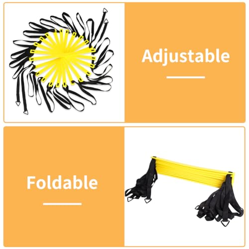 - Agility Ladder and Cones 20 Feet For Soccer Training: Suitable for beginners and professional athletes, this agility ladder is a must-have for improving speed, endurance, agility, coordination, quickness and overall athletic performance, Exercise Equipments 10 Soccer Cones and 4 Metal Pegs: This agility training equipment comes with 12 solid rungs, 10 premium sports cones and bonus 1 carry bag and 4 metal pegs for different drills and techniques, Easy Adjustable 12 Ladder Rungs Not Tangled: This soccer speed ladder is designed with premium plastic and straps. Features pre-assembled rungs with reinforced plastic construction and non-slip straps to maintain positioning during drills on grass, turf, gym floors, or indoor surfaces, Versatile Rung Spacing for All Skill Levels: The exercise ladder has been assembled prior and does not tangle easily. Rung spacing adjusts easily to support diverse footwork patterns and training progressions for athletes of all levels, from youth sports to competitive training, Wide Range of Occasions: Made of premium materials, our agility ladders are suitable for indoor facilities, outdoor fields, and multi-sport training including soccer, hockey, basketball, and football, Complete Training Package: Includes a 20-foot agility ladder with 12 adjustable rungs, 10 durable sports cones, 4 metal ground stakes for stability, and a carry bag for convenient storage and transport, Includes a 20-foot agility ladder with 12 adjustable rungs, 10 durable sports cones, 4 metal ground stakes for stability, and a carry bag for convenient storage and transport