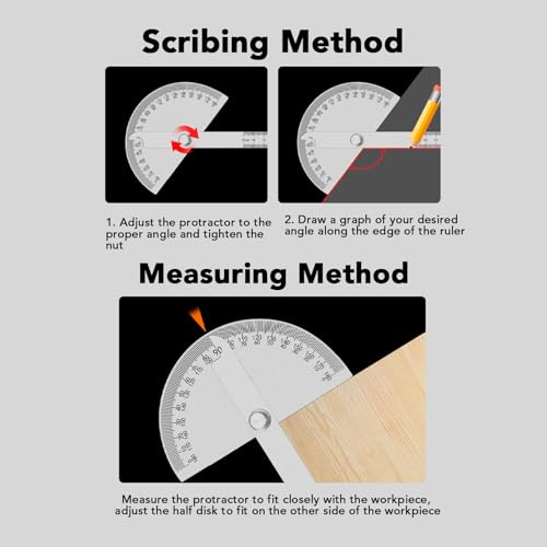 - Dual Function Design The adjustable protractor features an etched measuring ruler and an adjustable angle measuring tool, combining angle and length measurements in one device. The ruler allows accurate length measurement in a range of 0-10cm, while the protractor can accurately measure angles from 0-180 degrees., Adjustable Arms The stainless steel protractor is equipped with adjustable wing nuts, which can be tightened to fix the angles in place, allowing easy identification and reading of angle measurements. This feature allows accurate angle adjustment and measurement and is suitable for various basic work and study requirements., MULTI-FUNCTIONAL This angle is erosion resistant, sturdy and deformation resistant, ensuring long-lasting quality. It is ideal for a variety of applications including engineering, angle measurement, student drawing, architectural design and length measurement, making it a useful tool for craftsmen, designers, artists and engineers., PRECISE ANGLE MEASUREMENT The adjustable arms and clear angle markings of the stainless steel protractor allow accurate angle measurements for tasks such as drawing slate planes, radial lines and marking angles. Its excellent construction and accurate measurements make it a tool for various projects and applications., CONVENIENT AND USER FRIENDLY The ergonomic design, adjustable arms and user-friendly functionality of the angle search ruler make it an essential tool for professionals and enthusiasts alike. Whether for technical drawings, artistic projects or craft tasks, this versatile tool provides accuracy, durability and comfort in angle and length measurements.
