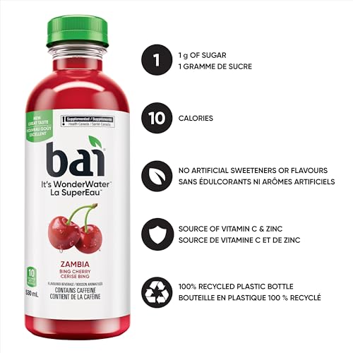 - Bai. It's WonderWater. Amazing New Taste – Even More Wow. Each bottle contains Vitamin C (a dietary antioxidant), Zinc, and 100mg of polyphenols from tea and coffeefruit extracts in every bottle., EXOTIC BOLD FLAVOURS: Bold fruit flavours inspired by locations all over the world., NO ARTIFICIAL SWEETENERS: Naturally sweetened with Stevia., CAFFEINE: A unique blend of white tea and coffeefruit extracts provides 65mg of caffeine per 530mL bottle, SUSTAINABLE PACKAGING: rPET bottle made from 100% recycled plastic, excluding cap and label.