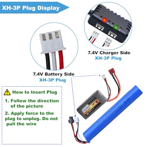 - 【2-in-1 Efficiency Charging】--- 7.4V 1A 2S Lipo battery charger is designed for charging Two 2s 7.4V lithium polymer or li-ion battery at the same time,it will help save your time, very efficiency., 【Good Performance】--- 7.4V 1A 2S Lipo battery charger cable with build-in smart IC protection board, it can protect the battery over-charged,over-voltage,over-load,can extend the using lifetime., 【LED Indicator】---- 7.4V 1A 2S Lipo battery charger with LED indicator,The green light is flashing and the red light is solid when it is charging; the green light is solid and the red light is off when it is fully charged., 【Smart Charger】--- Input: DC5V/2A,Output:DC 7.4V/2A(Independent channels),Charging current:1A, Connector-- USB to XH-3P Plug,Support power sources from Power Bank,Phone charger,computer or other device with USB port., 【Widely Application】7.4V 1A 2S Lipo battery charger with XH-3P plug fit for some RC Car Trucks,please make sure the voltage and the plug are all match. 7.4V 1A 2S Lipo battery charger with XH-3P plug fit for some kinds of splatter ball gun, please confirm the voltage and the plug are all match before purchase. 7.4V 1A 2S Lipo battery charger with XH-3P plug cable fit for RC Helicopter Remote Control Airplane, RC Boat,please confirm the voltage and the plug are all match before purchase.