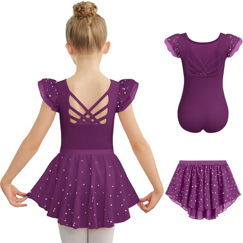 Zaclotre Ballet Leotards for Girls Toddler Ruffle Sleeve Crisscross Back Dance Dress Outfit with Removable Skirt Combo Dark Purple