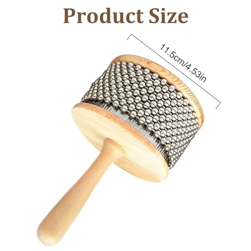 - Size: With a diameter of 11.5 cm (4.53 inches), the cabasa is easy to handle and ideal for musicians of all ages and skill levels. Its compact size makes it convenient to carry and store, ensuring it fits seamlessly into any musical setup., Quality Materials: Constructed from quality stainless steel and wood, this cabasa musical instrument is both long-lasting and visually appealing. The sturdy materials ensure long-lasting performance, making it a reliable instrument for frequent use., Wide Application: Ideal for classroom music teaching, the cabasa is a valuable tool for music education. It can be used in music games, band accompaniments, and various educational activities, helping students develop rhythm and coordination skills while having fun., Easy to Play: This latin percussion is designed for simplicity. By rubbing your hand over the metal beads on the cylindrical surface, you can easily produce a unique percussive sound. Its straightforward design makes it accessible to beginners and enjoyable for experienced musicians., Versatile Sound Effects: In addition to its distinctive percussive sound, the cabasa can create special shaking effects, enhancing musical compositions. It blends seamlessly with other instruments, adding depth and texture to various musical styles.