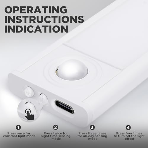 - Indoor Motion Sensor Light: The cabinet base light has 4 modes (always on mode/all day sensor mode/night sensor/always off mode) can be freely switched, set and adjusted to automatically sense human activities., Upgraded Motion Sensor Under Cabinet Lights: Set the under cabinet light to motion sensor mode, This light will intelligently turn on the indoor motion sensor light when human activity is sensed within a range of 10 feet and 120°。When there is no motion detection, it will automatically turn off after about 20 seconds., Adjustable 3 Color Temperature & Dimmable: The electric under cabinet light bar can switch between 3 color temperatures with one button, 3000K (warm white light), 4500K (natural light) and 6500K (cold white light). Long press the settings key to change the brightness., USB-C Rechargeable & Larger Capacity Battery: The rechargeable closet light built-in 400mAh capacity battery. When fully charged, the motion sensor light can last 10-15 hours in always on mode. 2-3 month in dark sensor mode., Lightweight & Easy to Install: Indoor Motion Sensor Lights feature a 1CM ultra-thin design. Each smart slim sensor light comes with two clips. Attach the clips to the back of the light.Peel off the tape on the back of the tab.Attach the light to the desired location.