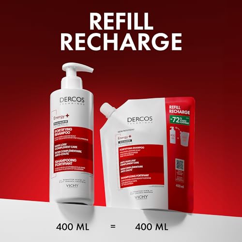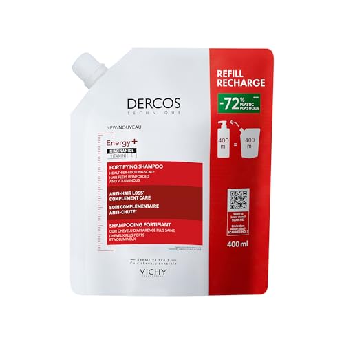 - Fortify & Reduce Breakage: Infused with potent Niacinamide and Vitamin E, this shampoo gently cleanses while intensely fortifying hair fibers to reduce the risk of hair loss due to breakage, leaving your hair visibly stronger., Sustainable Refill Solution: This refill pack for your DERCOS ENERGY+ Fortifying Shampoo helps reduce plastic, utilizing 72% less plastic compared to the standard 400mL bottle., Strength & Volume: Experience +47%* reinforced hair fibers and 3x** stronger hair with 24-hour long-lasting volume. Our powerful formulation helps repair damage from breakage, as proven by instrumental tests after just 5 uses., Revitalized Hair & Healthy Scalp: Beyond strengthening, this formula revitalizes and nourishes hair from root to tip, reducing frizz and leaving your scalp feeling healthier and hydrated for overall hair vitality., Ideal Complementary Care: Designed as the perfect partner to the REGEN Booster Hair Serum, this shampoo maximizes results, ensuring comprehensive care for hair prone to breakage. *After 5 uses of the shampoo. **Instrumental test conducted on Energy+ Shampoo alone.