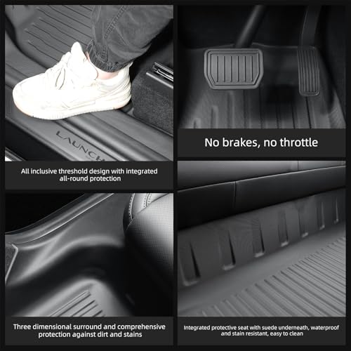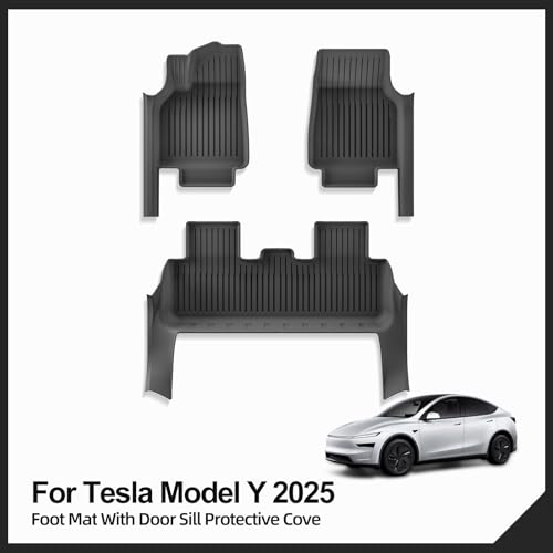 - 1. Suitable for automobiles: This foot mat with door sill strips is specially tailored for Tesla Model Y Juniper 2025 2026 NEW 5 Seat. **NOTE: Before installing the floor mats, please remove the original gross surface carpet before installing, otherwise the fit effect may be affected, 2. Material: Made of TPE material, which is resistant to high and low temperatures, ensuring good performance in all weather conditions. The material is soft and durable, antiskid and anti-shock, protects your car from wear and tear, 3. Comprehensive Coverage, Easy to Clean: Foot mats with door sill cover are designed to comprehensively cover the dirty areas of the car, including the door sill strips, effectively reducing shoe stains from scratching the car paint. The water and dirt-resistant material can be easily cleaned by wiping with a damp cloth or rinsing with water, keeping the interior of the car neat and tidy, 4. Slip-resistant design, safe and stable: the footrest adopts a snap-fastening installation form to ensure that the footrest is stable and does not shift, even when braking sharply or turning the corner, it can also be kept in place to protect the safety of driving. The door sill strip fits tightly to avoid sliding and rattling, 5. Note: The package is sent folded, please don't worry if you find the product deformed after receiving it. Please soak the product in hot water for a few minutes, or use a hot hair dryer to heat the deformed part for a few minutes, these creases will gradually disappear. Or put the product outside under the sun for half a day, the crease will also gradually disappear